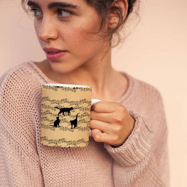 Black Cats Mug with Heart Handle – Music Mug – Notes Ceramic Mug