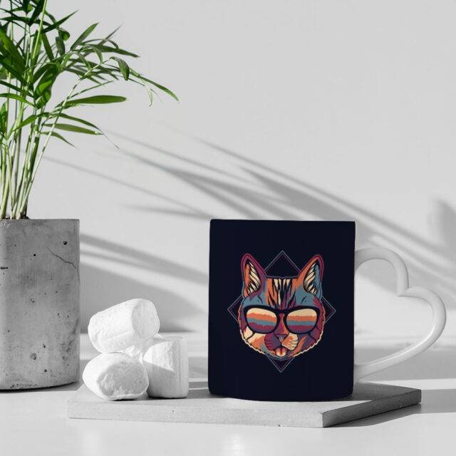 Cool Cat Mug with Heart Handle – Colorful Mug – Cat In Glasses Ceramic Mug